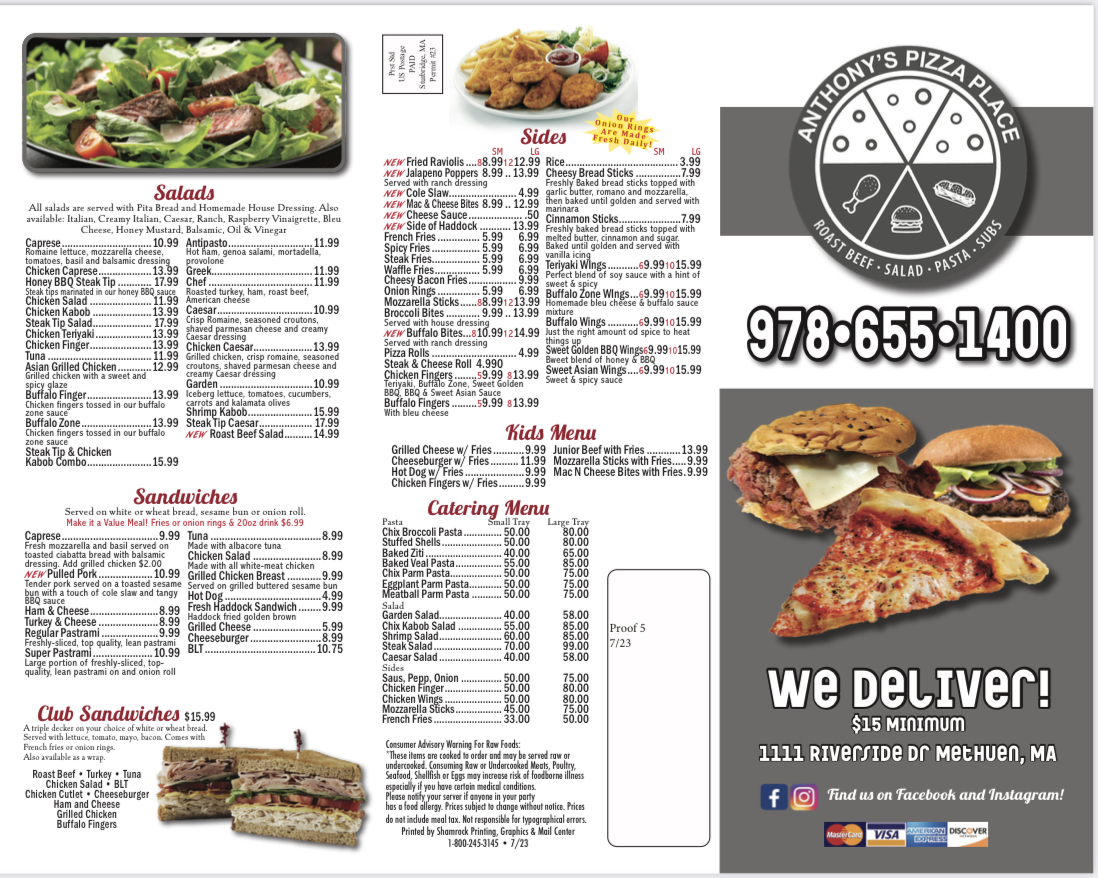 Welcome to Anthony's Pizza Place & Roast Beef, where food dreams come true at 1111 Riverside Dr, Methuen, MA. Renowned for its delicious blend of classic pizzas and standout roast beef sandwiches, Anthony's offers a menu that delights every palate.